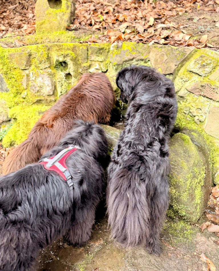 16 Neufis und 30 Zweibeiner hatten sich um 11:00 Uhr vor dem ‚Stahlecker Hof‘ versammelt, um die gut einstündige Strecke durch Wald und Wiese unter die Pfoten und stiefelbewehrten Füße zu nehmen. Bei munteren Gesprächen – man hatte sich ja schon längere Zeit nicht gesehen – war der Weg gut zu bewältigen und auch die Hunde hatten jede Menge Platz um Rennen und Toben.