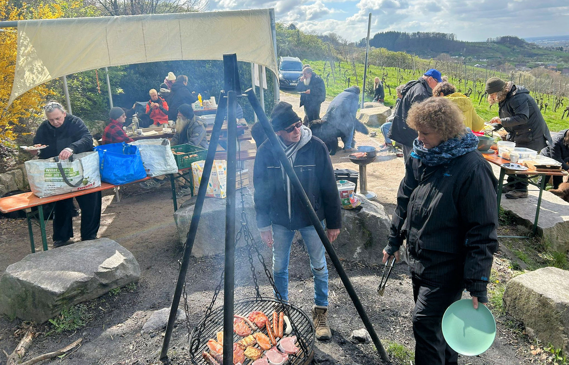 Und dass sich die Menschen prima verstanden und eine Menge zu diskutieren und plaudern hatten, versteht sich ja fast von selbst. Zumal das Organisationsteam alles aufs prächtigste vorbereitet hatte: Grillfeuer, Essen und Trinken in Hülle und Fülle und selbst mit dem Wetter hatten wir einigermaßen Glück! Kein Regen, kein Schnee (wie in den Tagen vorher), immer wieder wärmende Sonne und dass ab und zu ein kalter Wind über den Berghang strich war nun auch keine große Überraschung, wenn man wusste, dass die Hütte dicht bei der Burg Windeck liegt (nomen est omen).