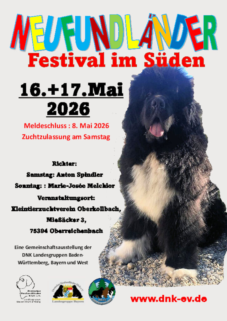 16./17. Mai 2026 – Neufundländer-Festival im Süden. Eine Gemeinschaftsausstellung der Landesgruppen BaWü, Bayern und West. 75394 Oberreichenbach; Richter: Toni Spindler (Sa) und Marie-Josée Melchior (So)
